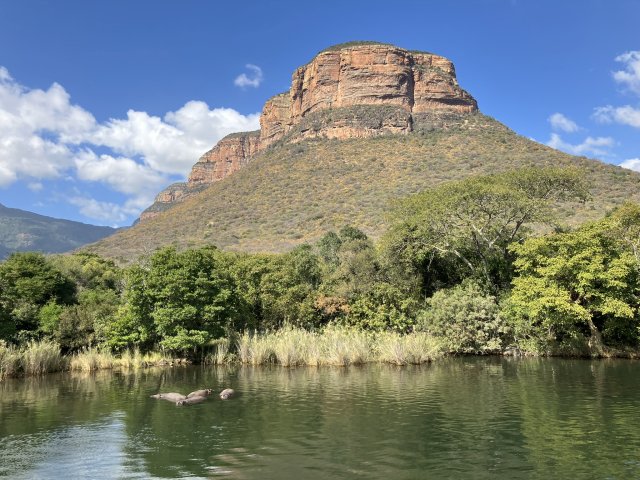 - Bootstour im Blyde River Canyon. Sehr geruhsam, tolles Panorama. Nach dem Frühstück bringt uns ein Fahrer der Lodge im Minibus zum Park, die Bootstour macht ein dortiger Anbieter, danach werden wir zurückgefahren und sind rechtzeitig zum Mittagessen zurück. Wir machen diese Tour zu sechst und dadurch ist der Preis mit 48 € angenehm.